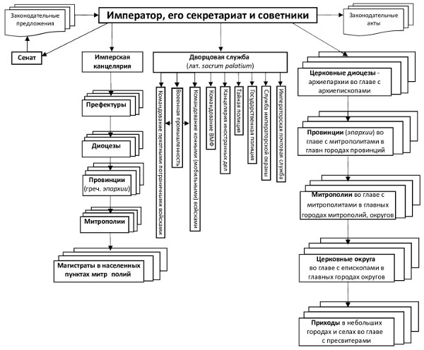 | Префектуры. Руководители - префекты претория. Крупнейшие территориально-административные единицы. В единой империи их 4, после ее разделения на Восток и Запад - по 2. Проводили кадровое укомплектование нижестоящих чиновничьих структур, сбор налогов, строительство дорог и пр. Рассматривали судебные дела и апелляции в пределах своей юрисдикции. Состояли из диоцезов. | Архиепископии древнейших церквей (Александрия, Антиохия и, до разделения империи на две части, Рим). Позднее эти кафедры будут называться патриаршими. Управляли кадрами, судом, сбором/учетом/расходом средств, церковным имуществом, строительством храмов, больниц, приютов и т.п. | – « – |